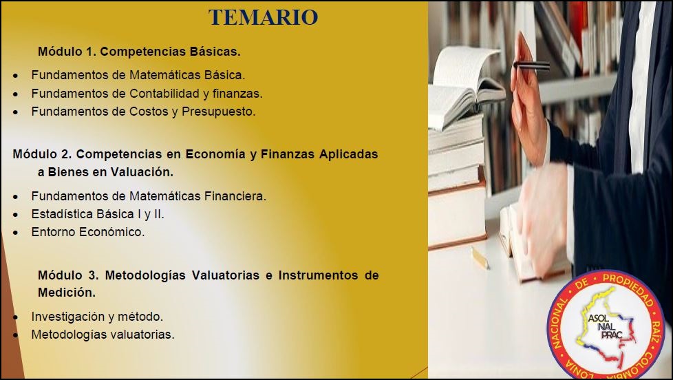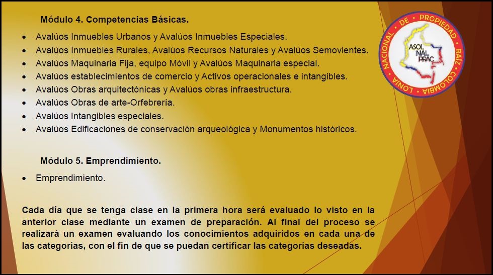 La Asociación Lonja Nacional de Propiedad Raíz y Avaluadores de Colombia, lanza su programa homologación en avalúos para obtener las categorías de REGISTRO ABIERTO DE AVALUADOR, en el cual veras teoría de cada una de las categorías y metodologías con el fin de graduarte en carreras técnicas registradas ante el ministerio de educación, para obtener por régimen académico los registros ante el Ente Regulador de Avaluadores. Ofrecemos desde tres categoría hasta las trece categorías registradas en el Decreto 556 del 2014.